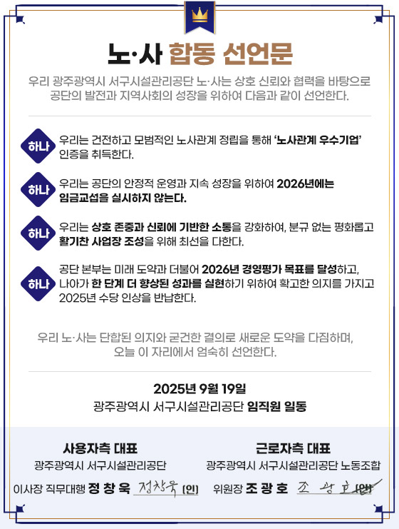 보도자료 광주 서구 상무국민체육센터, 2025년 최우수 공공체육시설 선정 2025.11.21 광주서구시설관리공단-광주공유센터, 자원 선순환 체계 구축 업무.. 2025.11.20 광주 서구시설관리공단 '노사 합동 선언문' 발표 2025.09.24 광주서구시설관리공단, 동천동 공영주차장 범죄예방 우수시설 인.. 2025.09.10 광주서구시설관리공단, 유소년 무료 축구·배드민턴 강습 운영 2025.08.08 더보기